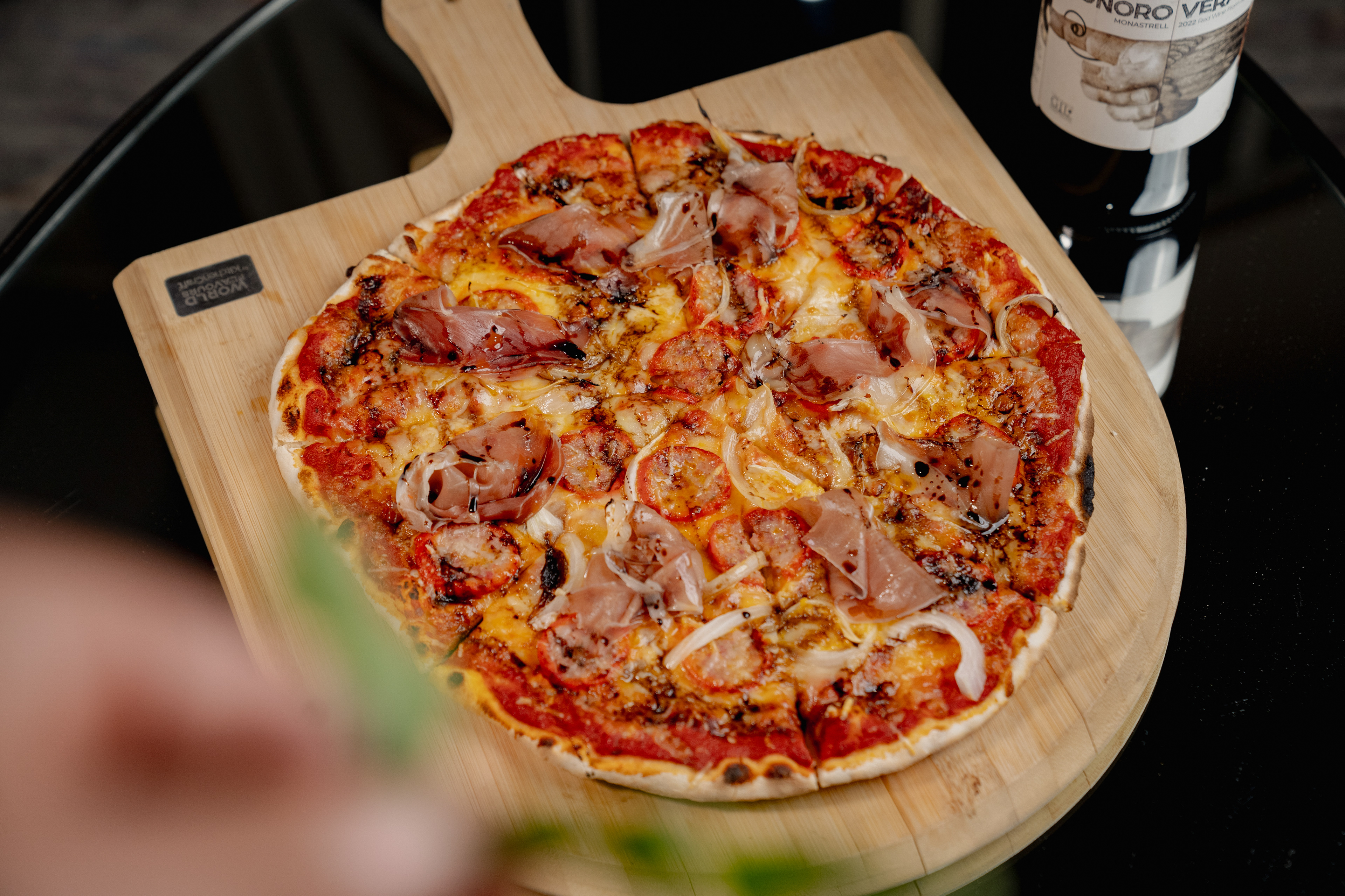 ITÁLICA | Láminas de jamón serrano, salchicha huachana, cebolla rostizada y queso parmesano.